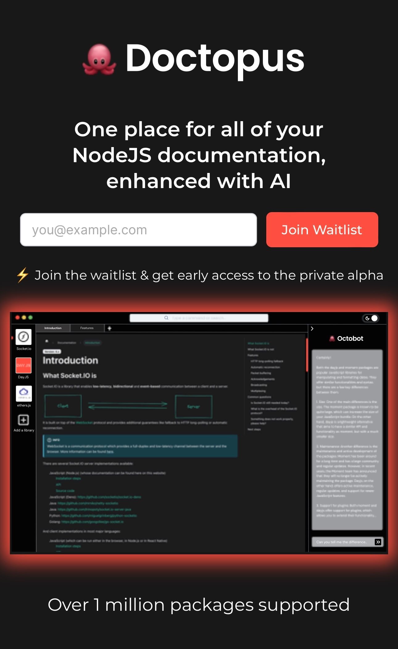 Doctopus.ai while it isn’t available yet, what we see is a huge win for devs. Think of the next time you onboard someone on your project and they wonder what a certain package does? Or you who have been in the project for so long you forgot a dependency you had in there. We think this is going to crush it