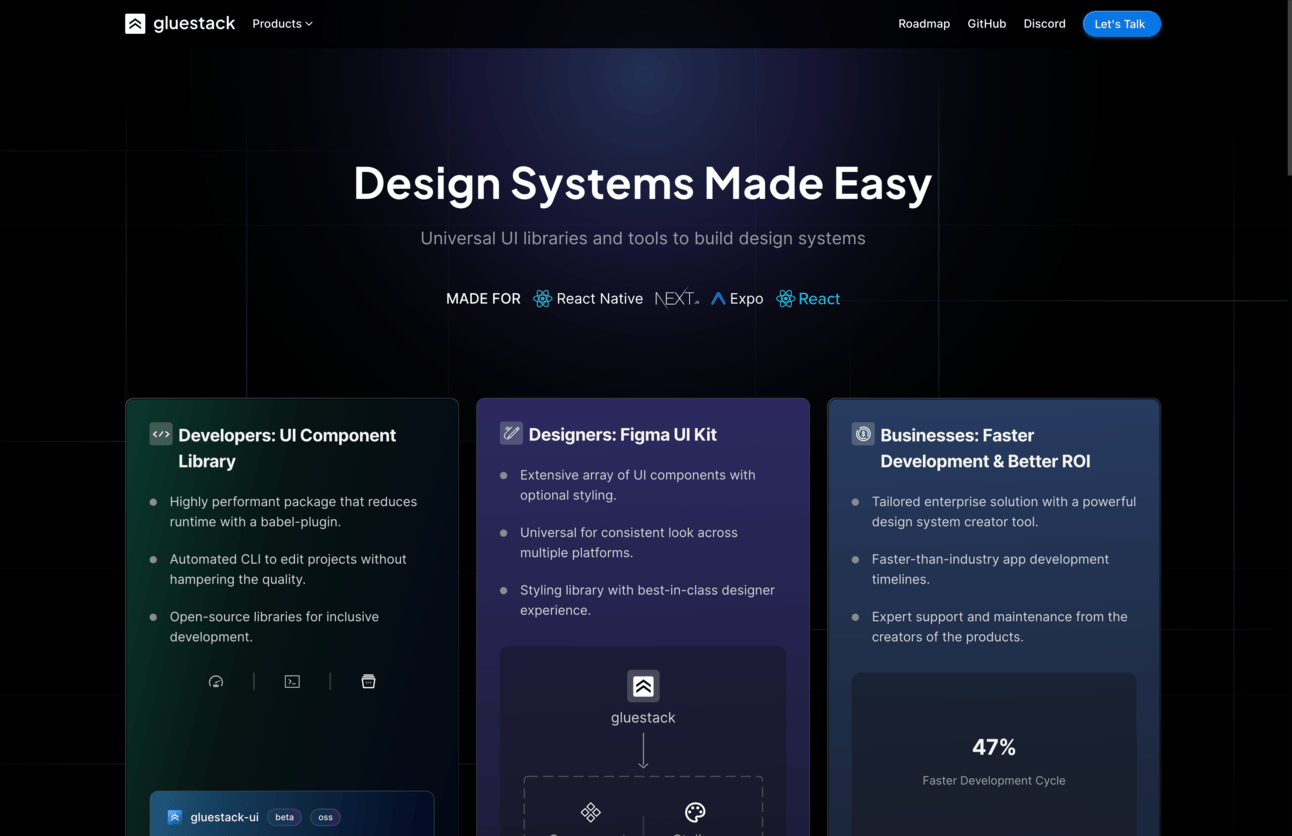 Gluestack.io is an awesome new component library from the makers of nativebase.io. Their newest project is gluestack.io which provides accessibility right out of the box! It also allows you to build once and deploy many places and have your UI aligned. It is in beta but we have tried it out with a fresh Expo.dev app